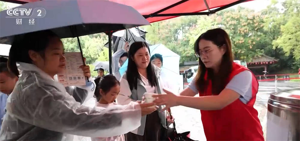 r在湖北襄阳古隆中景区,工作人员提前熬煮好姜汁可乐装入纸杯,有序分发给游客,游客们手捧热饮,驱散了秋雨的寒意。为了最大程度减少雨天对出游体验的影响,景区还组织志愿者开展流动服务,为游客免费发放雨衣,同时放置了多台吹风机与暖风机,方便游客及时烘干淋湿的头发和衣物。