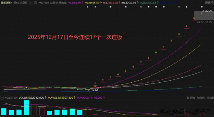 从2025年12月17日启动至今,股价已从不足17元一路飙升至82.25 元,短短一个多月时间,累计涨幅高达383%,不仅轻松实现翻倍,更一举成为开年以来A股连板次数最多的“新妖王”。