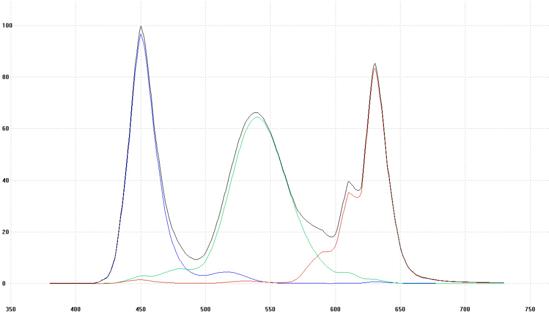 而在光谱方面,背光灯珠的蓝光峰值恰好位于450nm。不偏不倚,正好卡在“硬件低蓝光”的标准线上。