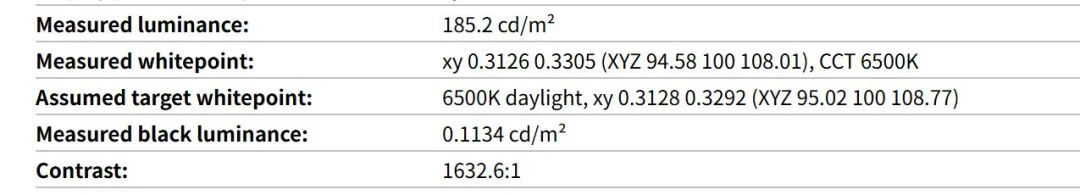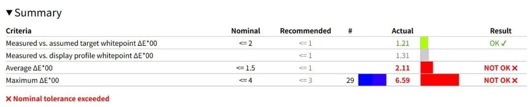 这块屏幕的DeltaE明显偏高,色彩准确性较为糟糕。平均2.11、最大6.59的色彩准度,足以让软件打出“NOT OK”评级,无法胜任专业用途。