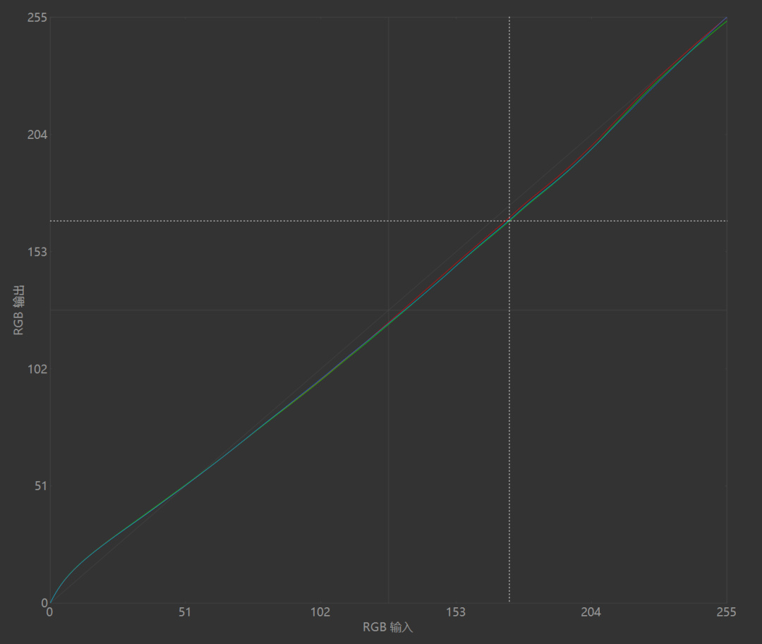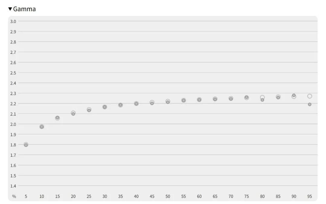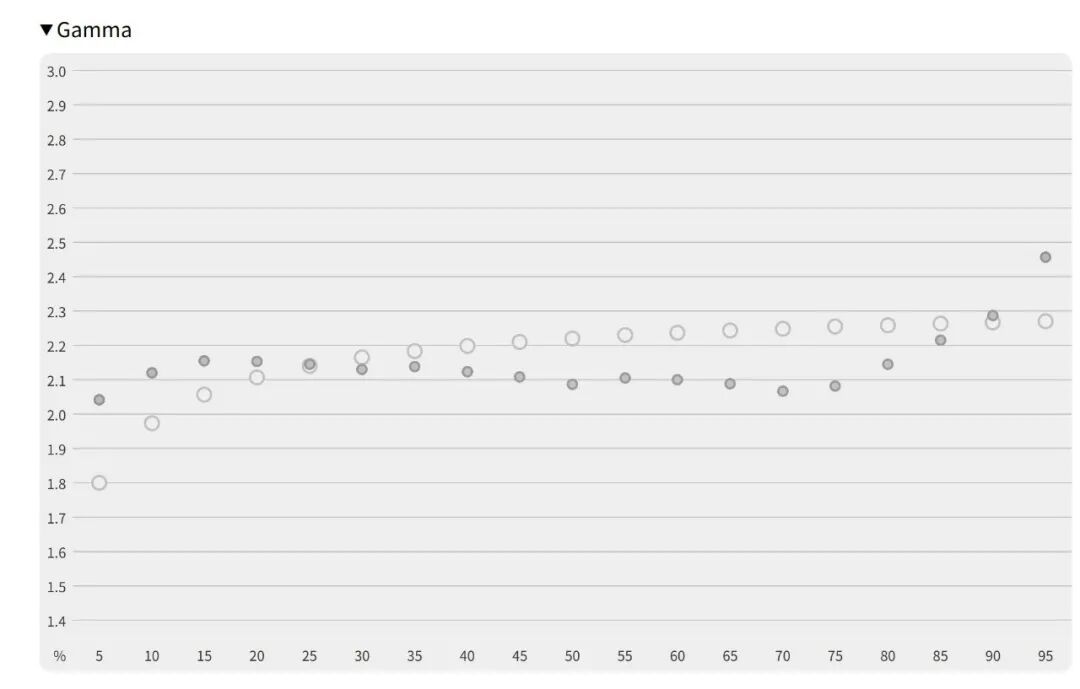 让我们继续向下看去,这块屏幕的问题还不止于此:Gamma曲线关乎色彩的平滑渐变,相对而言,越是贴合这条曲线,越符合人眼非线性的视觉特点。