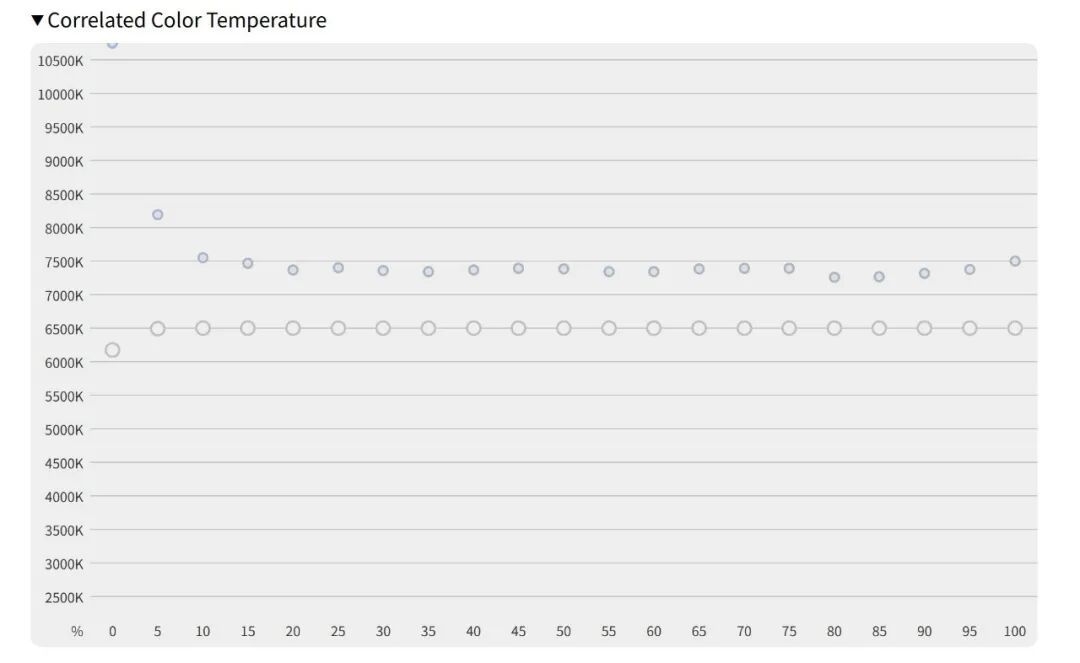 与显示器菜单中所标注的“6500K色温”截然不同,我们实测得到的色温竟高达7500K!