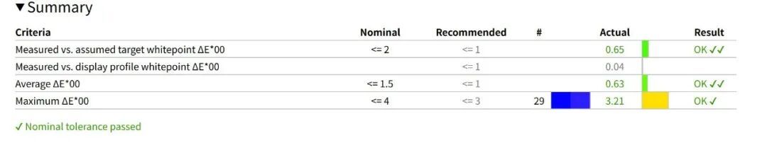 配合Windows“自动管理应用的颜色”功能,屏幕色准也被修正为平均0.7、最大2.2 DeltaE的“OK”评级之下。