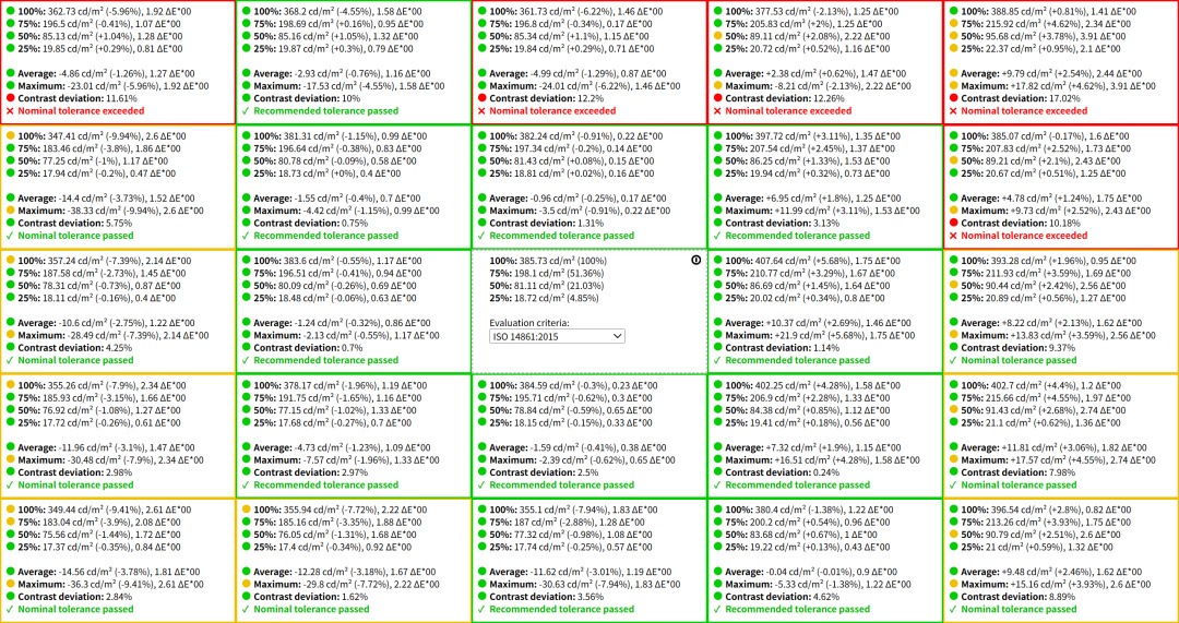 在400nit最大亮度下、总计25个检测分区中,亮度偏差高于5%的分区约有8个,色度偏差接近4的分区仅有1个。没有亮度偏差超过10%的分区。